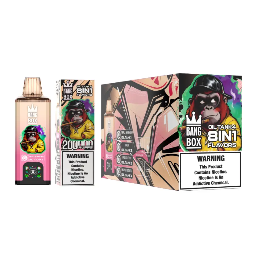 El Vape 8 en 1 Bang Box 200k ofrece una experiencia de vapeo desechable de ultra alta capacidad con hasta 200.000 caladas. Incorpora una batería duradera de 850mAh y una resistencia mesh de 1,0Ω que garantiza un vapor estable y lleno de sabor. Gracias a su diseño avanzado 8 en 1 y a la selección de 10 sabores populares, proporciona variedad y comodidad de larga duración. Equipado con carga rápida Type-C y presentado en 10 unidades por caja y 120 unidades por cartón, el Bang Box 200k es ideal para compradores mayoristas, ofreciendo alto rendimiento, precios competitivos y envío gratuito.