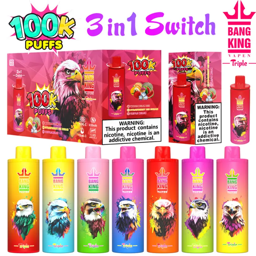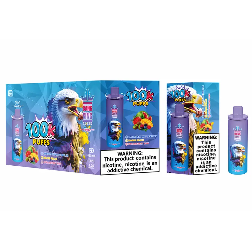 Bang King 100000 Puffs: Vive la experiencia definitiva del vape desechable con nuestra gran capacidad de 45ml, batería recargable de 650mAh con Tipo-C y pantalla inteligente. Este dispositivo ofrece unas increíbles 100k caladas con un sabor consistente gracias a su coil de malla de 1.0 ohm. Elige entre 10 opciones de sabores triples, cada uno diseñado para una satisfacción máxima. Disfruta de la comodidad del envío gratuito en pedidos al por mayor. Embalaje estándar: 10 piezas por caja, 200 por cartón. Perfecto para un rendimiento duradero y una experiencia vapeadora premium.