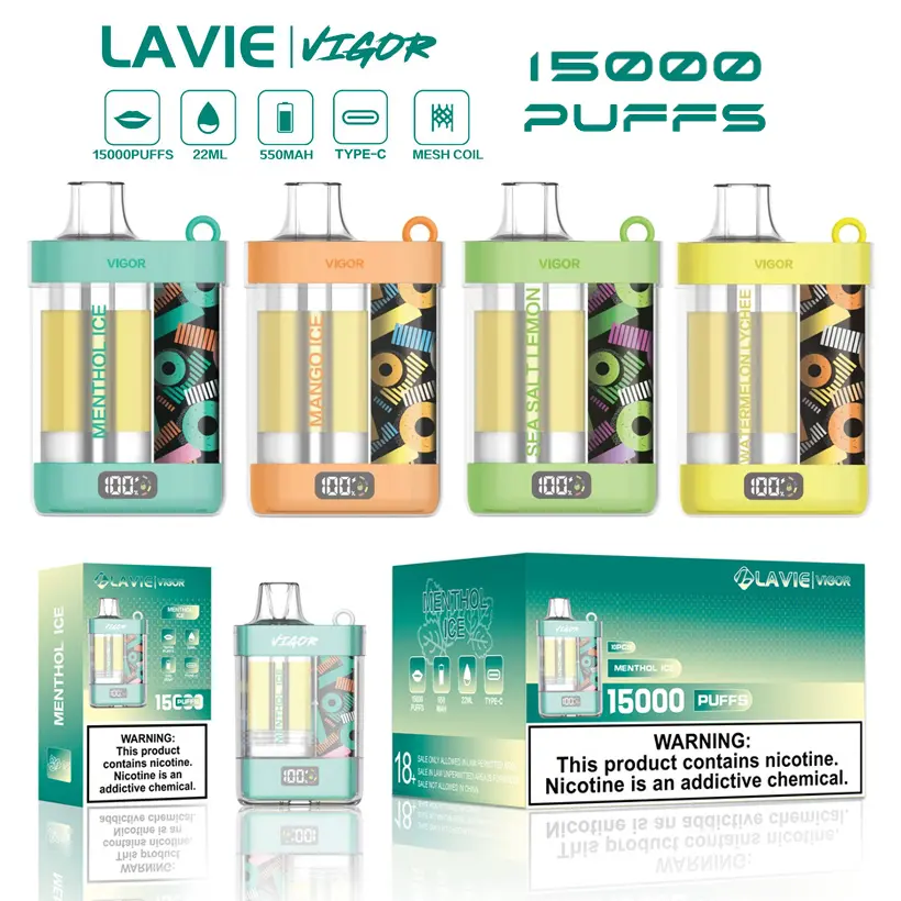 Lavie Vigor 15K Puffs 15000 cigarrillo electrónico desechable con 12 sabores batería 550mAh 22ml líquido resistencia mesh carga Type C venta al por mayor envío gratuito experiencia de vapeo suave para uso diario.