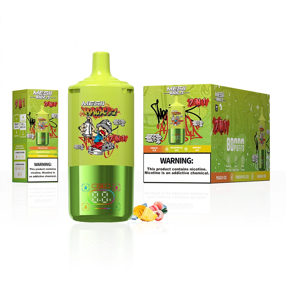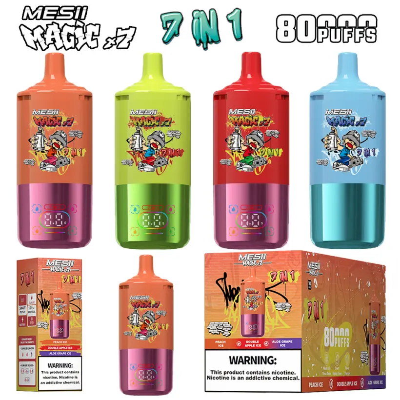 El vape desechable recargable Mesii 80K Puffs Magic 7 en 1 ofrece hasta 80000 caladas con una batería de 850mAh y bobina mesh suave para un vapor consistente y lleno de sabor. Cuenta con carga rápida Tipo C, 10 sabores populares y versátil funcionalidad 7 en 1. Ideal para compradores al por mayor con embalaje a granel y envío gratuito desde almacén en la UE.