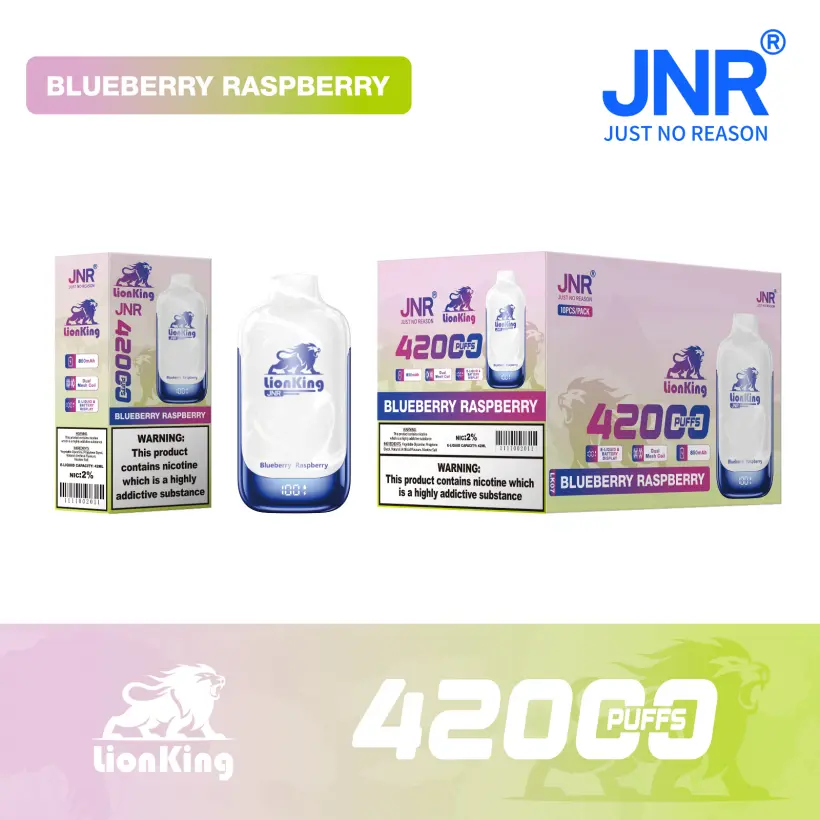 Puff JNR 42K Lion King vape desechable ofrece hasta 42000 caladas gracias a su batería de 850mAh y su suave bobina mesh que proporciona un vapor rico y sabroso. Incluye pantalla inteligente para un fácil control, carga Tipo C y 10 deliciosos sabores. Ideal para ventas al por mayor o minoristas con empaquetado a granel (10 piezas/caja, 200 piezas/cartón) y envío gratuito desde almacén en la UE.
